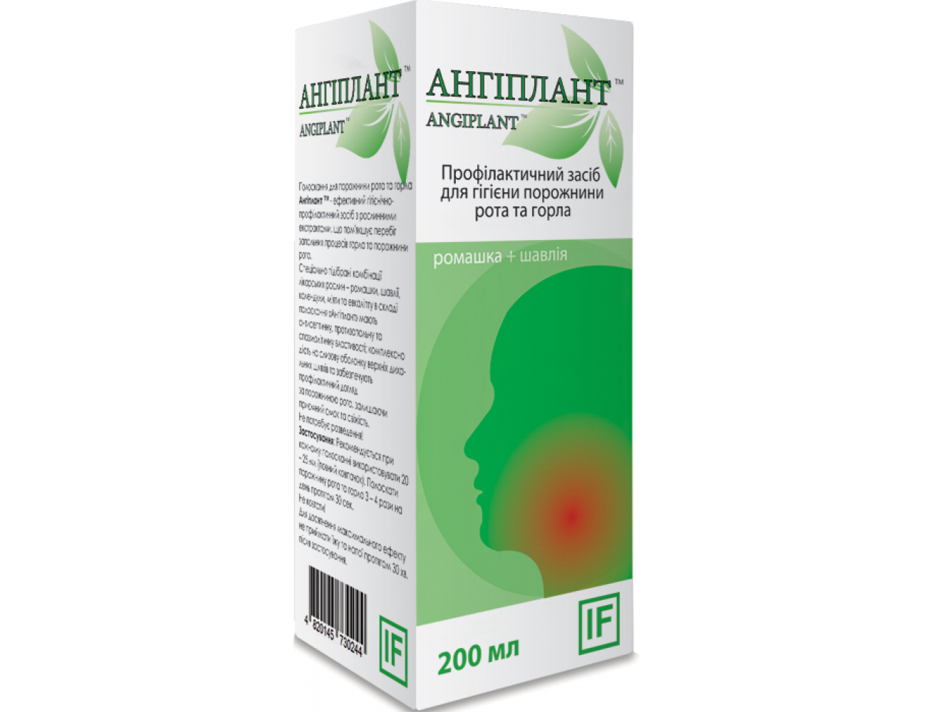 Ангиплант - раствор для полоскания для полости рта и горла, эффективный гигиенически профилактическое средство с растительными экстрактами, что смягчает течение воспалительных процессов горла и полости рта.Специально подобранная комбинация лекарственных растений - ромашки, шалфея, календулы, мяты и эвкалипта в составе полоскания Ангиплант обладают антисептическим, противовоспалительным и спазмолитическим свойствами; комплексное действие на слизистую верхних дыхательных путей и обеспечивают профилактический уход за полостью рта, оставляя приятный вкус и свежесть. Не требует разведения.