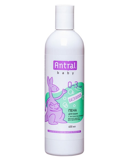 Детская пена для ванн Antral Baby 0-3 года легко пенится, подходит для всех типов кожи, содержит экстракт ромашки, увлажняет кожу.