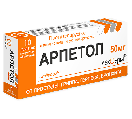АрпетолСостав1 таблетка содержит: арбидола гидрохлорид (в пересчете па 100 % содержание) - 50 мг или 100 мг, вспомогательные вещества: лактоза, целлюлоза микрокристаллическая, крахмал модифицированный (Starch 1500), магния стеарат, аэросил, поливинилпирролидон низкомелокулярный медицинский 12600±2700, опадрай II (тальк, полиэтиленгликоль, титана диоксида спирт поливиниловый).ОписаниеТаблетки, покрытые пленочной оболочкой, белого цвета, с...