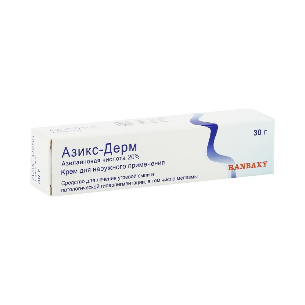 Азикс-Дерм – крем медицинский против угревых высыпаний. Обладает антимикробным качеством. Понижает количество свободных жирных соединений в дерме, приводит в норму кератинизацию. Выписывают при дерматите себорейном, мелазме, повышенной пигментации патологической формы.