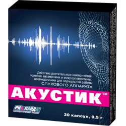 Биологически активная добавка к пище Акустик является источником флавонолгликозидов, кверцетина, ресвератрола, коэнзима Q10 и дополнительным источником магния, марганца, селена, фолиевой кислоты, биотина, витаминов Е , В 1 , В 6 , В 12 .Способствует нормализации работы слухового аппарата.
