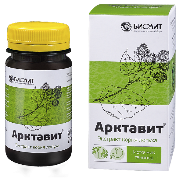Арктавит напиток чайный применяется в качестве биологически активной добавки к пище - источника полифенолов и гидроксикоричных кислот, содержащей инулин. Состав: экстракт корня лопуха, калия сорбат, натрия бензоат, вода дистиллированная.