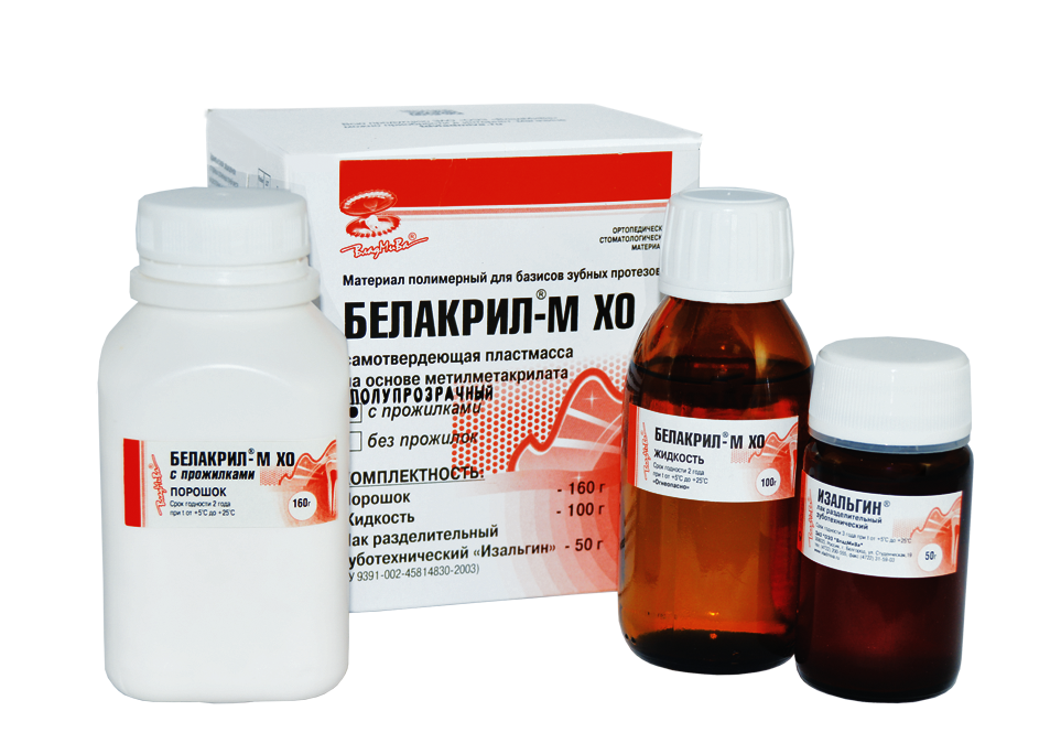 Базисные материалы «Белакрил» выпускаются в виде двух компонентов - порошка, содержащего полиэфиры метакриловой кислоты, катализатор реакции полимеризации перекись бензоила, и жидкости, содержащей мономер метилметакрилат (М) и/или мономер этилметакрилат (Э), после смешивания порошка с жидкостью образуется полимер, твердеющий при нагревании (горячего отверждения) - ГО или без нагревания (самотвердеющий) - ХО. Базисные материалы «Белакрил» отличает высокая технологичность, простота и быстрота изготовления изделий, имеющих высокое качество, функциональную долговечность, натуральный внешний вид и биосовместимость.