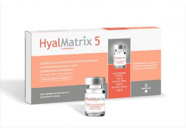 Гиалматрикс 5 - восстанавливающая сыворотка-мезококтейль, активные компоненты которой - гиалуроновая кислота и икра, обладают антивозрастным действием. сыворотка поддерживает тонус кожи, придает коже сияние и активно увлажняет эпидермис.