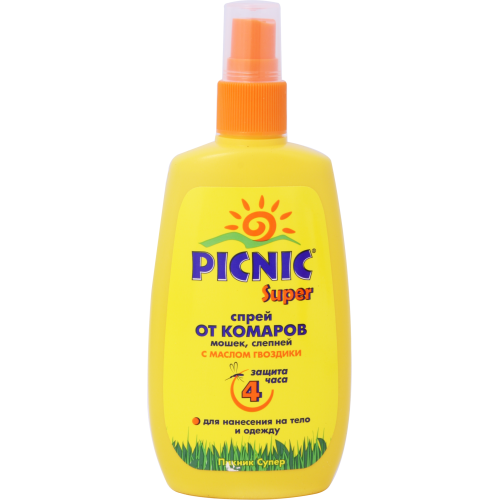 Спрей «Picnic Super» — ваш незаменимый защитник в поездках на природу. Формула, усиленная маслом гвоздики, обеспечивает защиту до 4-х часов. Форма продукта удобна для нанесения на одежду и кожу.
