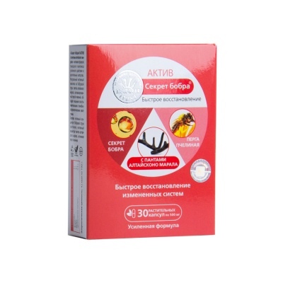 «Секрет бобра» АКТИВ с пантами алтайского марала – нативная формула природного комплекса усиленного действия в растительных капсулах. Натуральный нативный комплекс из бобровой струи, пантов алтайского марала, активизированный пергой пчелиной, обладает мощными восстановительными и лечебно-профилактическими свойствами.