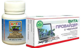 БАД рекомендован в качестве общеукрепляющего средства и для оптимизации рациона при повышенных нагрузками на зрение. «Вита-провайдер» - комплекс на основе черники, признанного антиоксиданта, дополненный витаминами и микроэлементами, преимущественно антиоксидантного действия - «снабжает» организм необходимыми для здоровья основными витаминами и микроэлементами.