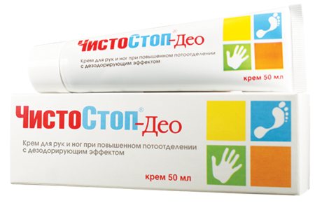 Чистостоп Део крем для рук и ног при повышенном потоотделении – эффективное косметическое средство, которое не сушит кожу и на длительное время берет повышенное потоотделение под контроль. Крем не просто маскирует неприятный запах, он устраняет саму причину повышенной потливости, снимает дискомфортные ощущения. Благодаря уникальному многокомпонентному составу крем подходит как для людей, страдающих излишней потливостью, так и в качестве профилактического средства для сокращения потоотделения и предотвращения по- явления неприятного запаха.