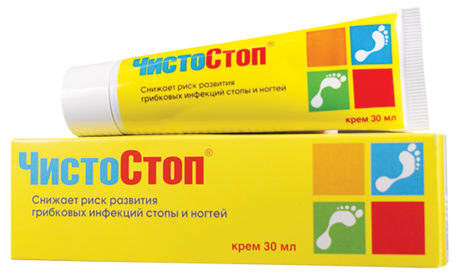 Чистостоп - крем для ног благотворно влияет на общее состояние кожи. Активные компоненты крема снижают риск развития грибковых инфекций стоп и ногтей, устраняют зуд, покраснения, оказывают антимикробное и противовоспалительное действия, заживляют, питают, смягчают и сохраняют оптимальный уровень увлаж- ненности кожи.