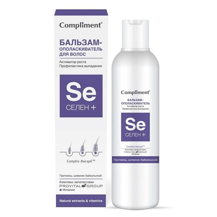 Compliment Селен+ Бальзам-ополаскиватель для волос - активатор роста, профилактика выпадения. Средство стимулирует обмен веществ в клетках кожи головы, укрепляет волосяные фолликулы, снижая количество потерянных волос, питает волосы, делая их более здоровыми и объемными. Активные компоненты комплекса Baicapil® (Испания), которые содержатся в основном составе средства, нормализуют жизненный цикл волосяных фолликулов, увеличивая толщину и количество волос в стадии роста, усиливают обменные процессы, восстанавливают структуру.