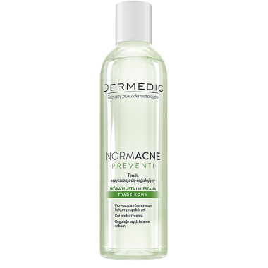 Очищающий регулирующий тоник Dermedic NORMACNE рекомендован при диагнозах:смешанная, жирная кожа, склонная к угревой сыпи и воспалениям пор