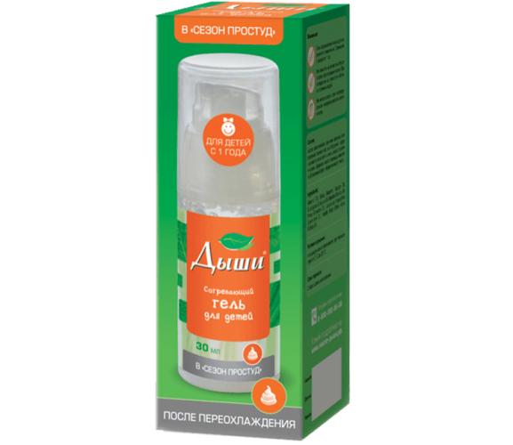 Дыши Согревающий гель для детей - разрешен к применению детям с 1 года. Препарат содержит барсучий жир, который активизирует кровообращение и оказывает согревающее действие. Выпускается в удобном флаконе с дозатором.