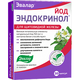 Эндокринол ЙодЭндокринол Йод — это специально разработанная фитоформула, в которой содержатся важные питательные элементы, необходимые для нормальной работы щитовидной железы: натуральный йод 150 мкг и лапчатка белая, способствующие:восполнению дефицита йодасохранению баланса гормонов щитовидной железыснижению затяжной усталости, плохого настроения и лишнего весаулучшению памяти и вниманияДействие ингрендиентов