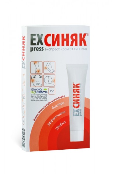 Экспресс Синяк - крем от синяков, предупреждает образование синяков, способствует ускорению рассасывания различных синяков на лице и теле, помогает решить проблему синяков после массажа, в том числе и антицеллюлитного, нанесение сразу после повреждения предупреждает появление синяка, быстро впитывается, не оставляет следов на одежде.