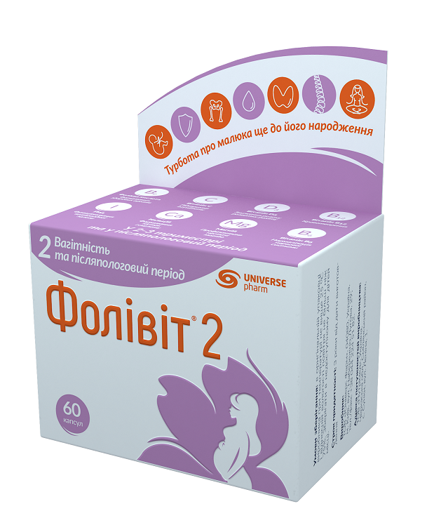 Витаминный комплекс Фоливит 2 рекомендован женщинам во время 2-3 триместра беременности и для восстановления организма женщины в послеродовой период, в рацион питания как дополнительный источник витаминов (фолиевой кислоты, колекальциферола, цианокобаламина, пиридоксина гидрохлорида, аскорбиновой кислоты) и минералов (йода, магния, кальция ) в организм человека.