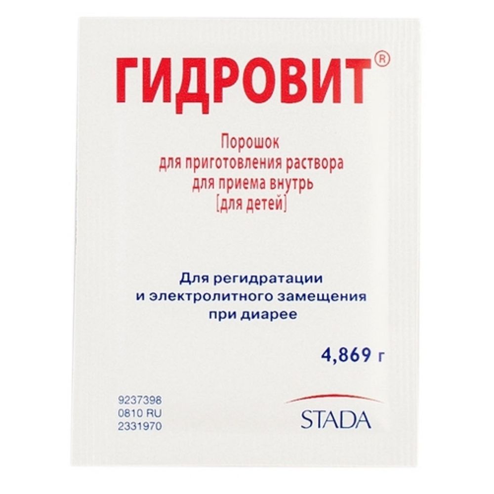 Один пакетик с порошком Гидровит для приготовления раствора для приема внутрь [для детей] содержит активные ингредиенты: натрия хлорид - 0,470 г, калия хлорид - 0,300 г, декстрозы гидрат - 3,560 г, натрия гидроцитрат - 0,530 г.Вспомогательные вещества: кремния диоксид коллоидный - 0,009 г.Общая теоретическая масса - 4,869...