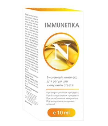 Капли Иммунетика - биогенный концентрат-капли на основе комплекса эковытяжек, микросфер масел, сока растений и органических биоконцентратов огнёвки, кордицепса, рейши, весёлки, прополиса и пчелиного подмора, оказывающих направленное действие на функции и состояние иммунокомпонентных клеток органов и систем, способствующих регулированию сопротивляемости организма инфекциям, инвазиям и чужеродным клеткам. Оказывает гармоничное действие на активность иммунокомпонентных клеток: при вирусных инфекциях (гриппе, острых респираторных инфекциях), при кронавирусной инфекции, при герпесной инфекции, при бактериальных инфекциях (пневмонии), при бактериальных осложнениях, при глистной инвазии, при опухолевой инвазии. Обладает свойством синергизма, оказывает действие при воспалительном процессе, лихорадке, болевом симптоме, спазмах сосудов головы и гладкой мускулатуры, гнойных ранах, кишечной ротавирусной инфекции.