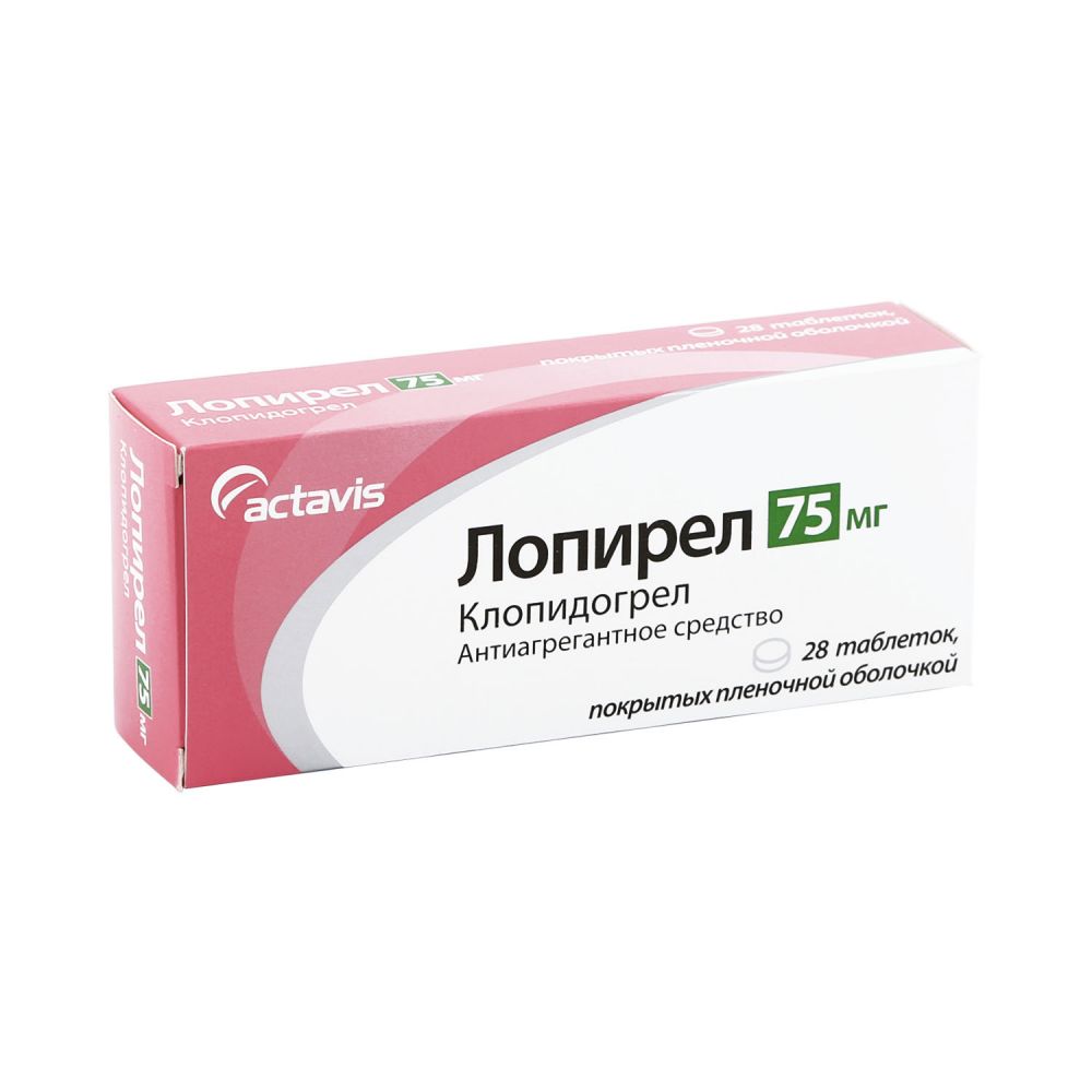 Действующее веществоКлопидогрелКоличество в упаковке100Лекарственная форматаблеткиПроизводительАктавис Лтд, ИсландияСоставДействующее вещество: клопидогрел гидросульфат 97,87 мг, соответствующий 75 мг клопидогрела основания;Вспомогательные вещества: лактоза, целлюлоза микрокристаллическая, кросповидон (тип А), глицерил дибегенат, тальк, Опадрай II 85 G34669 розовый (спирт поливиниловый, тальк, титана диоксид (Е171), макрогол 3350, лецитин (Е322), краситель железа оксид красный (Е172))Фармакологическое действиеЛопирел - антиагрегантное...