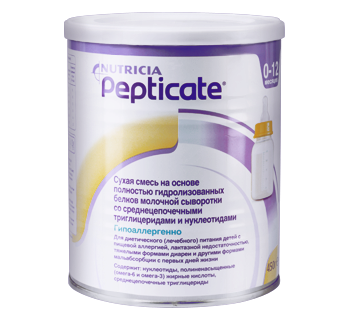 Смесь для лечения пищевой аллергии и атопического дерматита у детей грудного возраста. В смеси Пептикейт белок видоизменен и представлен продуктом полного ферментативного гидролиза сывороточного белка, поэтому минимизировано влияние на иммунную систему и вероятность аллергической реакции. Пептикейт можно применять как для перорального питания, так и для введения через зонд.